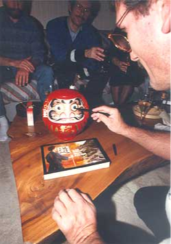 Selon la tradition, Pascal peint le deuxième œil du Daruma après 4 ans de travail : le premier œil avait été peint en 1985 et avait surveillé Pascal de son regard borgne pendant 4 ans.